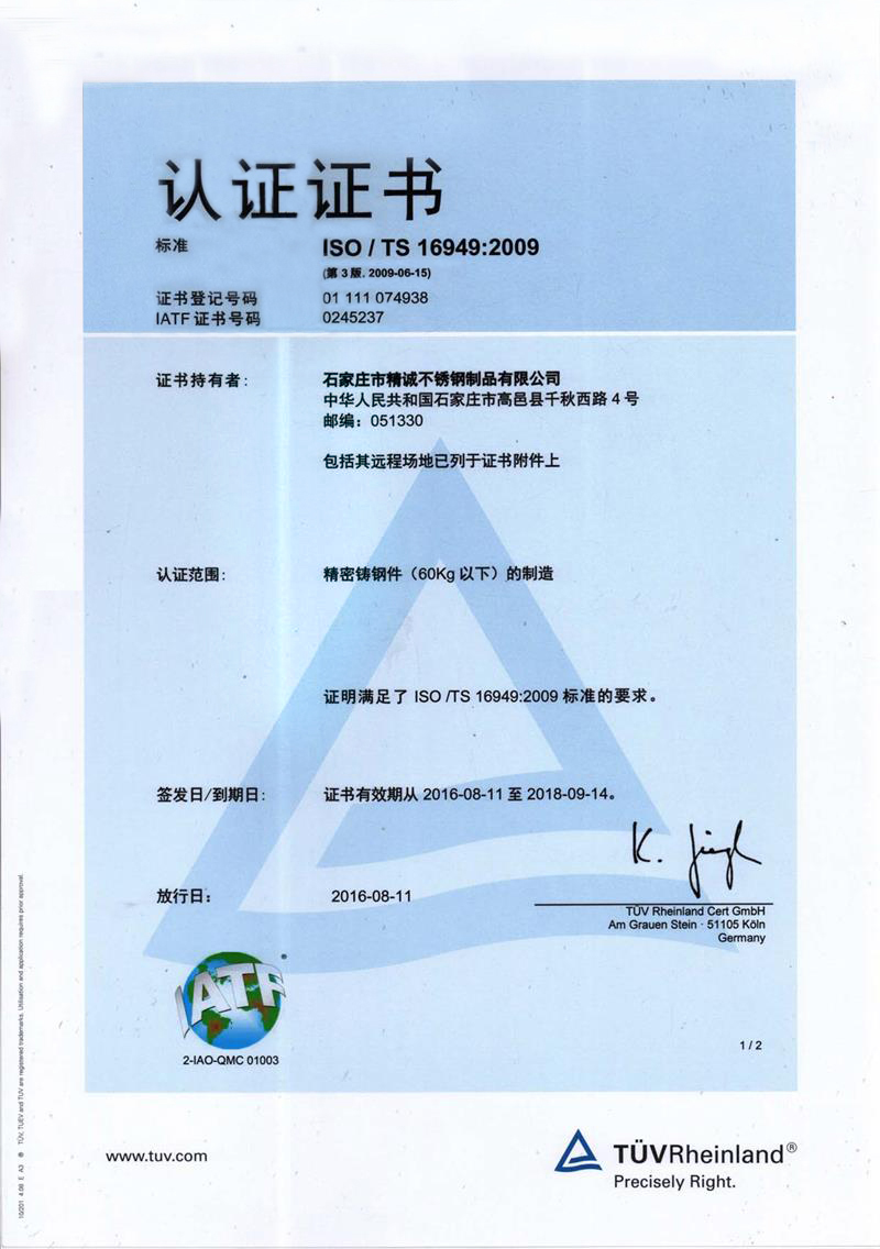 石家莊市精誠(chéng)不銹鋼制品有限公司,是一家從事專業(yè)精密鑄造的企業(yè)。主要生產(chǎn)不銹鋼、合金鋼、低碳鋼及各種特種合金材質(zhì)的精密鑄件及加工產(chǎn)品。
